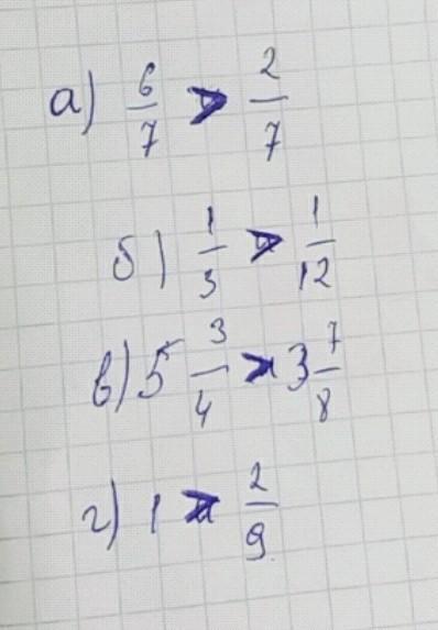 4)1 больше 2/9(1/1 приводим к общему знаменателю,9/9больше2/9).