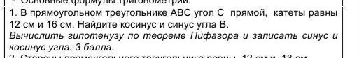 В прямоугольном треугольнике АВС угол С прямой, катеты равны 12 см и 16 см. Найдите косинус и синус угла В. ПОЖАЛУЙСТА