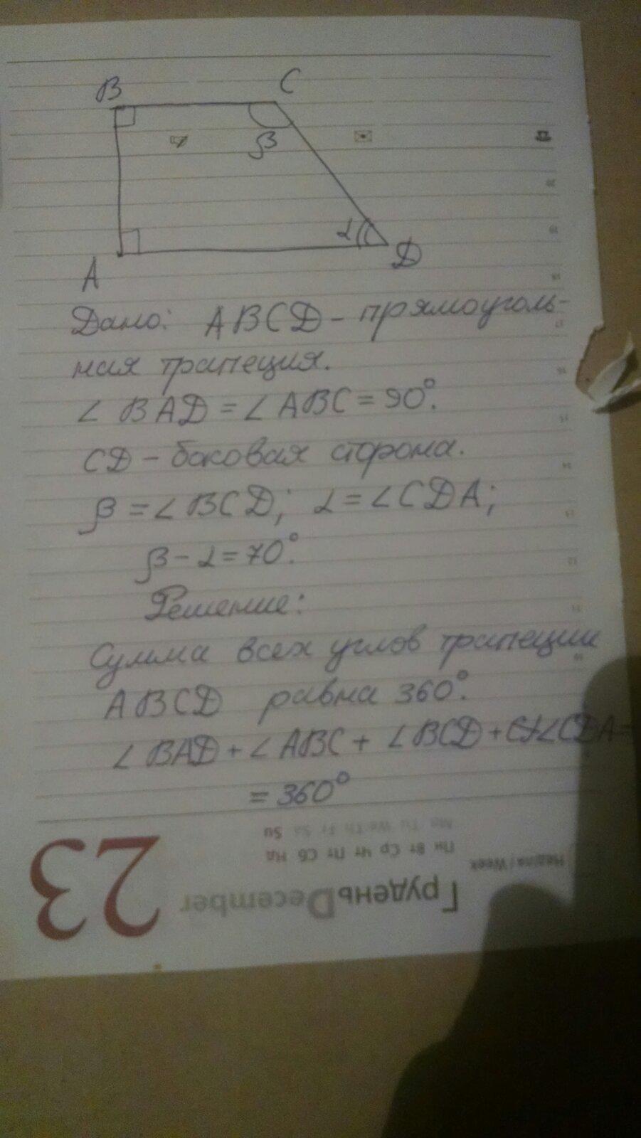 В прямоугольной трапеции разность углов при одной из боковых сторон равна 70˚.
