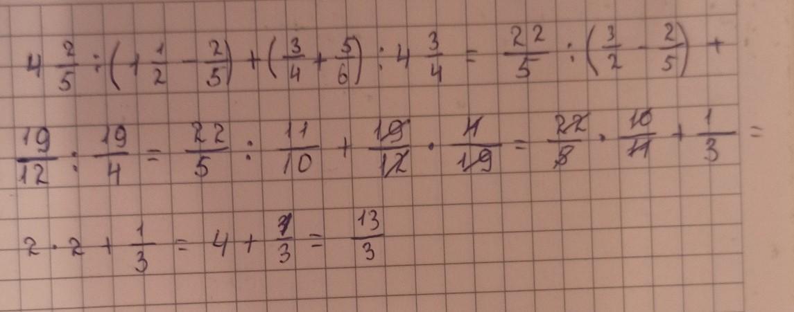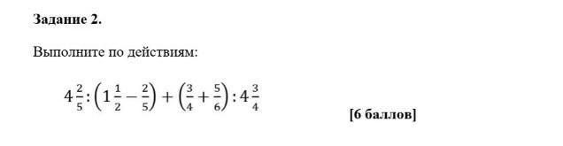 Задание 2. Выполните по действиям: 4 2/5 / (1 1/2 - 2/5) + (3/4 + 5/6) / (4 3/4)