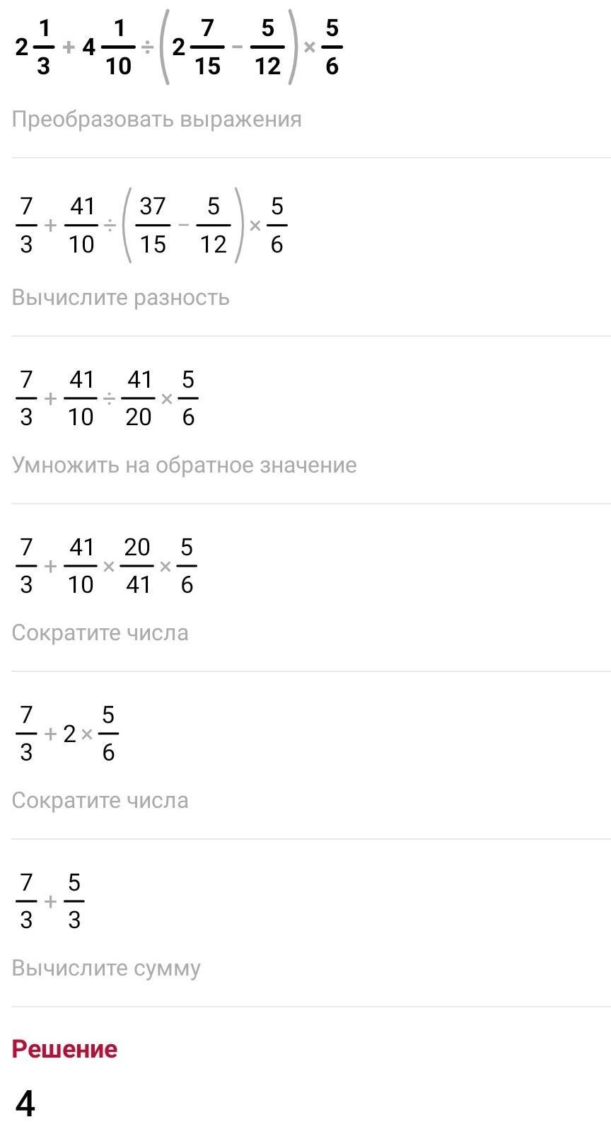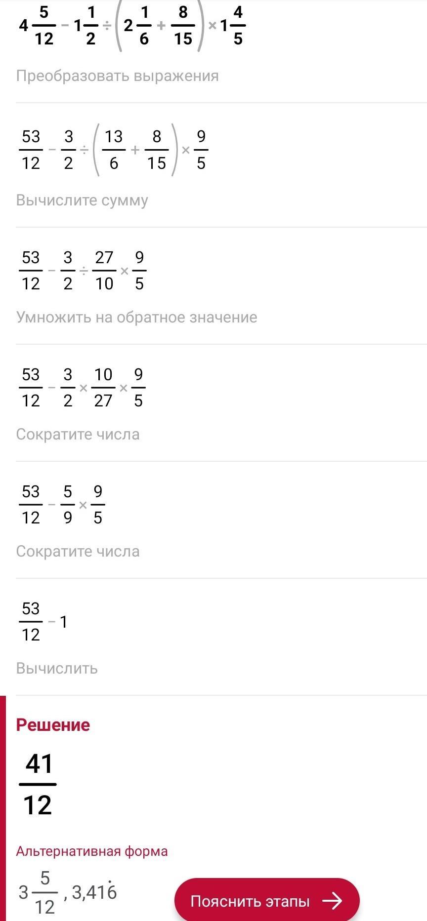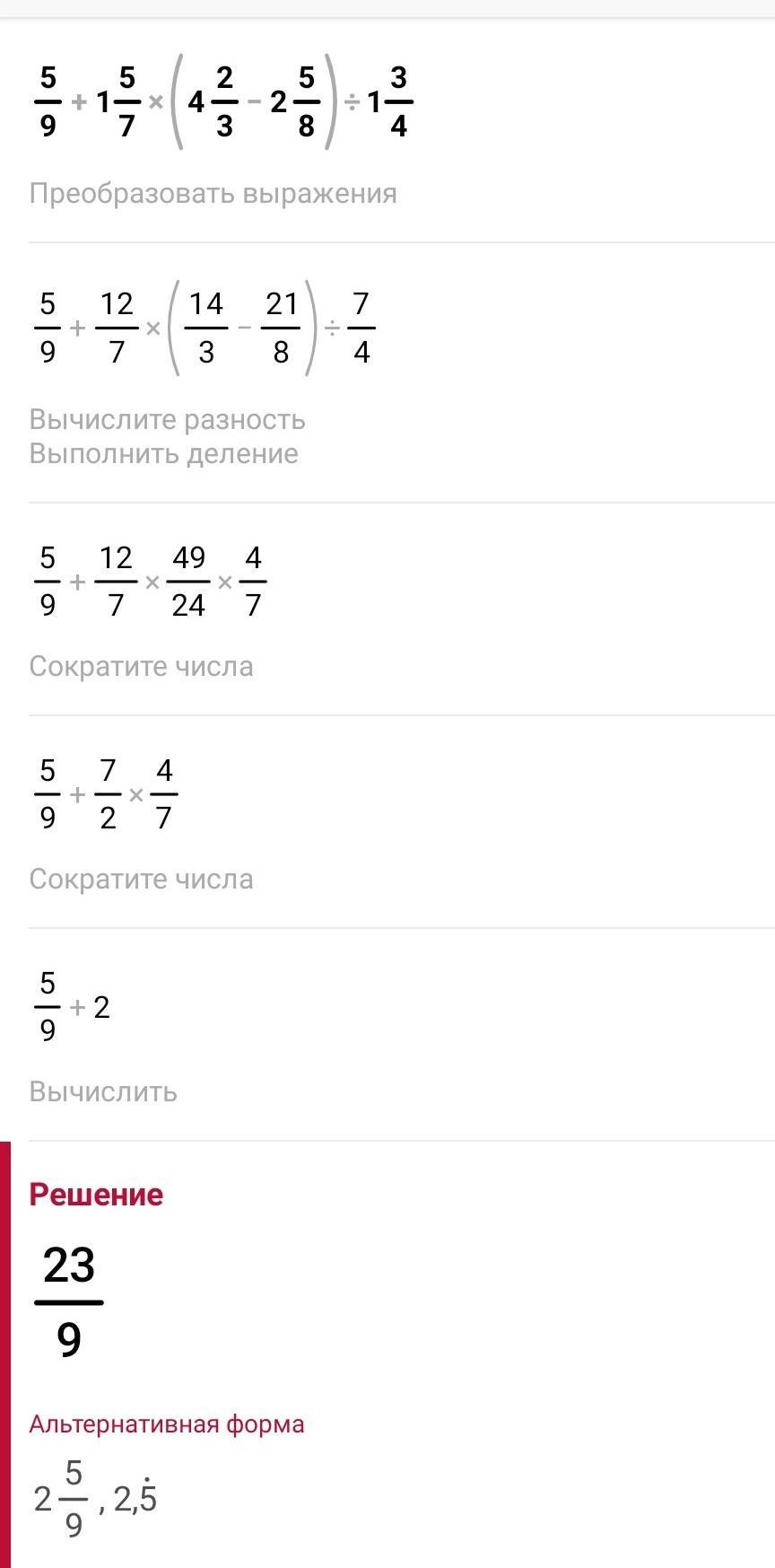 Вычислите: 1) 5/9+1 5/7•(4 2/3-2 5/8):1 3/4 2)2-3 1/7•(2-1 9/11):8/21 3)2 1/3+4 1/10:(2 7/15-5/12)•5/6 4)4 5/12-1 1/2:(2 1/6+8/15)•1 4/5