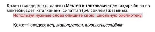 Біздің мектепімізде үлкен кітапханамыз бар .Ол екінші кабатта орналасқан,ол кең, жарық, және үлкен. Ол жақта қызықты кітаптар көп.Мен кітапханаға жие барамын.
