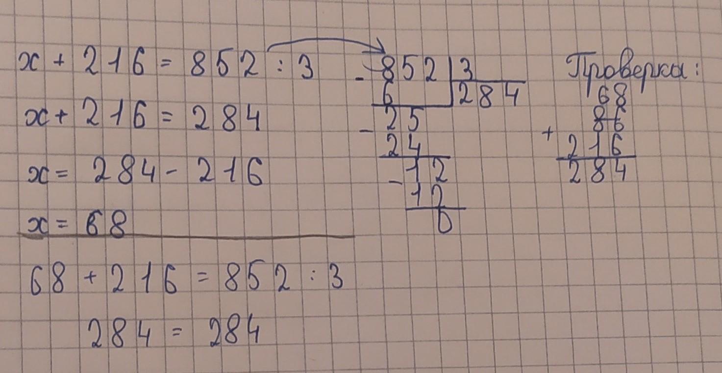 х+216=852÷3. Решение на фото ↑Это уравнение легко решается:сначала нужно переписать уравнение: х+216=852:3, затем выполнить действие деления: х+216=284, следующая строчка х=284-216, дальше ответ: х=68.