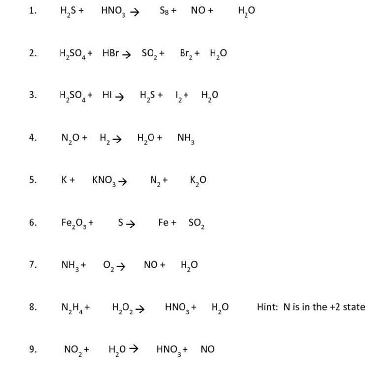 1. 3 H2S + 2 HNO3 → 2 NO + 3 S + 4 H2O