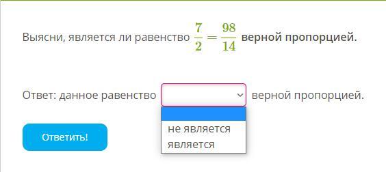 Выясни, является ли равенство 7/2 = 98/14 верной пропорцией.