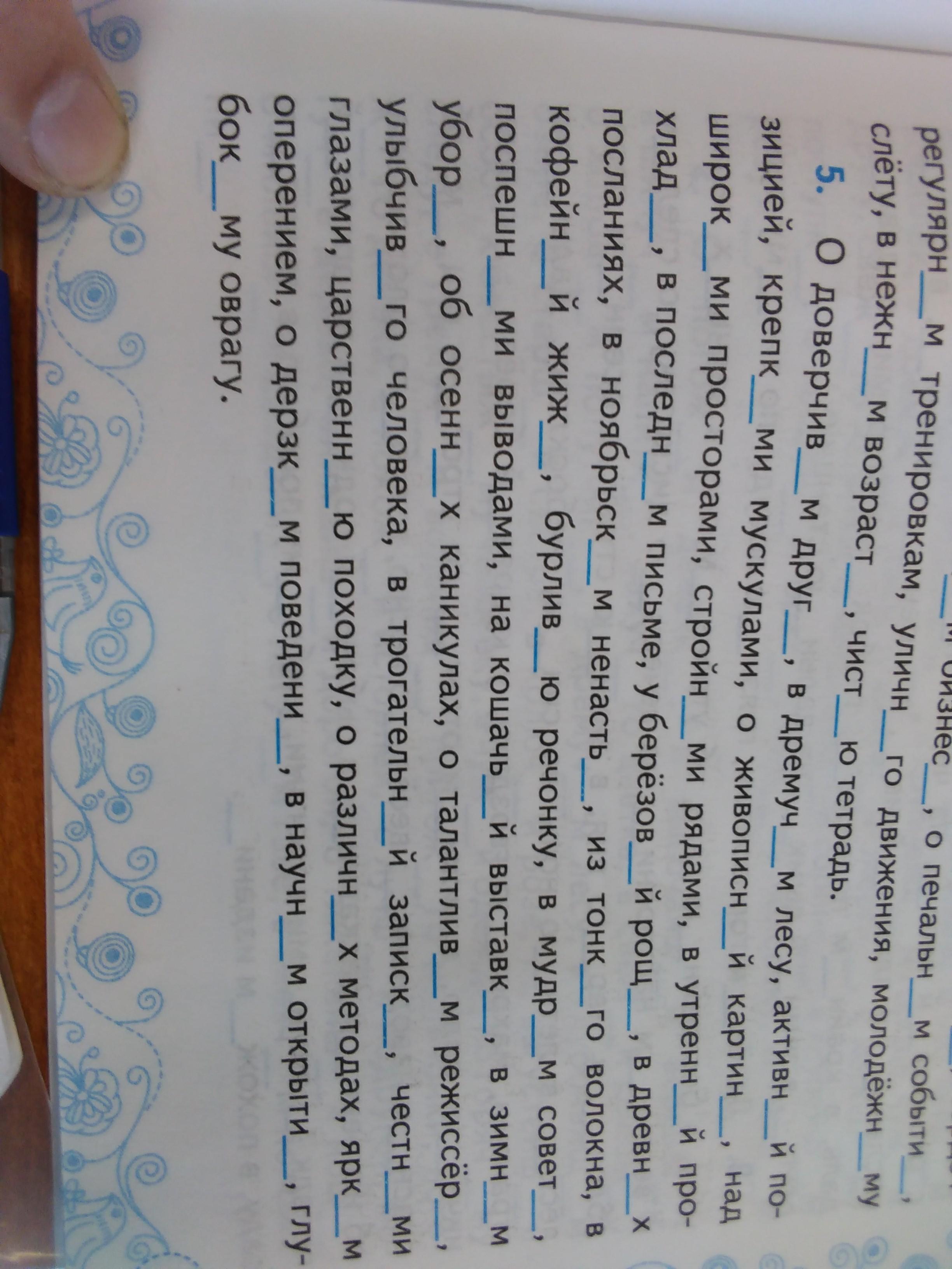 О доверчивом друге(Предложный падеж); в дремучем лесу(Предложный падеж);активной позицией(творительный падеж);крепкими мускулами(Творительный падеж);о живописной карине(предложный падеж);над широкими просторами(Творительный падеж);стройными рядами(Творительный падеж);в утренней прохладе(предложный падеж);в последнем письме(предложный падеж);у берёзовой рощи(родительный падеж);в древних посланиях(предложный падеж);в ноябрьском ненастье(предложный падеж);из тонкого волокна(родительный падеж);в кофейной жиже(предложный падеж);бурливую речонку(винительный падеж);в мудром совете(предложный падеж);поспешными выводами(Творительный падеж);на кошачьей выставке(предложный падеж);в зимнем уборе(предложный падеж);об осенних каникулах(предложный падеж);о талантливом режиссёре(предложный падеж);улыбчивого человека(родительный падеж);в трогательной записке(предложный падеж);честными глазами(Творительный падеж);царственную походку(винительный падеж);о различных методах(предложный падеж);ярким оперением(Творительный падеж);о дерзким поведении(предложный падеж);в научном открытии(предложный падед);глубокому оврагу(дательный падеж)
