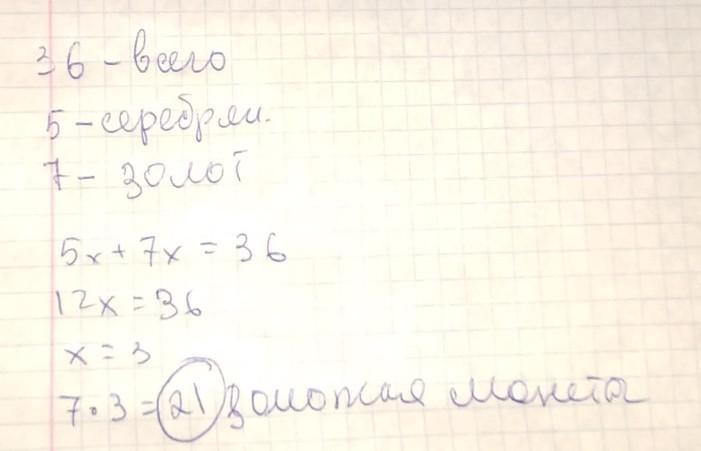 монеты стоят соответственно Поэтому 5 серебряных и 7 золотых монет соответствие обозначаем за X и решаем уравнения