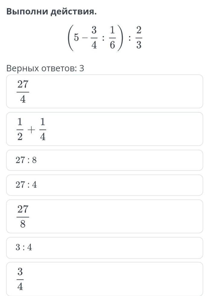 деление обыкновенные дробей и смешанных чисел.Урок5 выполни действия. (5-3/4:1/6):2/3 верных ответов: 3