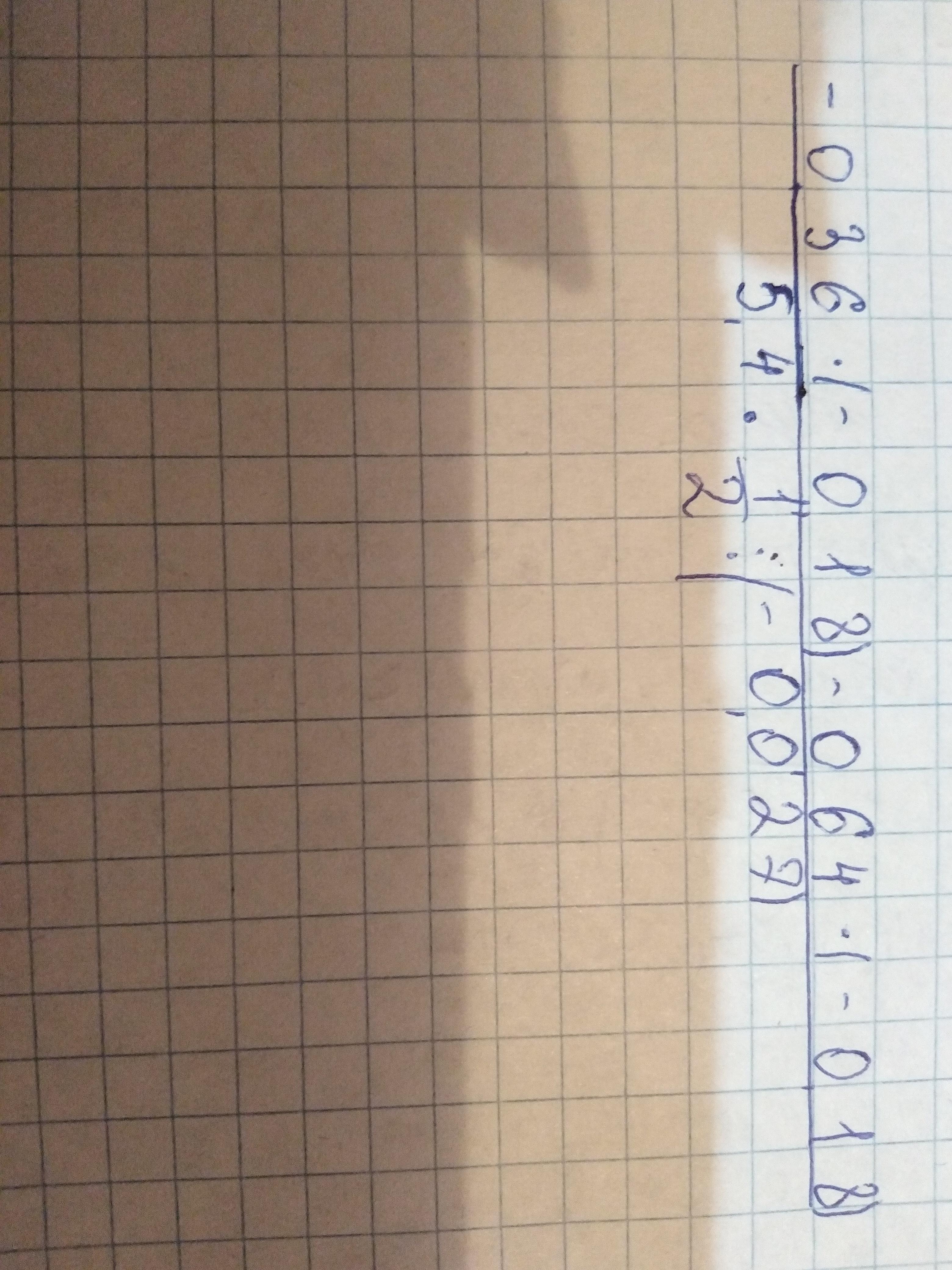 (-0,36·(-0,18)-0,64·(-0,18))/(5,4·1/2 ÷(-0,027))=(-0,18(-0,36-0,64))/(27/10 ·(-1000/27))=0,18/(-100)=-0,0018 или -1,8·10⁻³