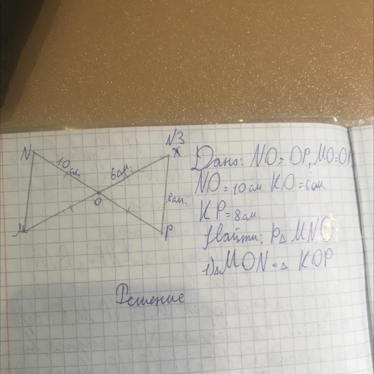 <NOM = <XOP как вертикальные, NO = OP, MO = OX, значит ∆МОN = ∆KOP по | признаку, следовательно NM = XP = 8 см.