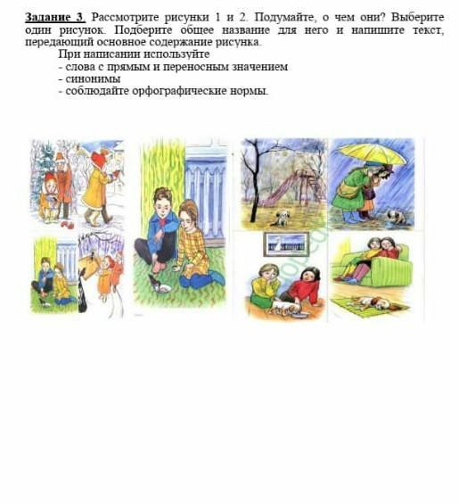 Задание 3. Рассмотрите рисунки 1 и 2. Подумайте, о чем они? Выберите один рисунок. Подберите общее название для него и напишите текст, передающий основное содержание рисунка.
