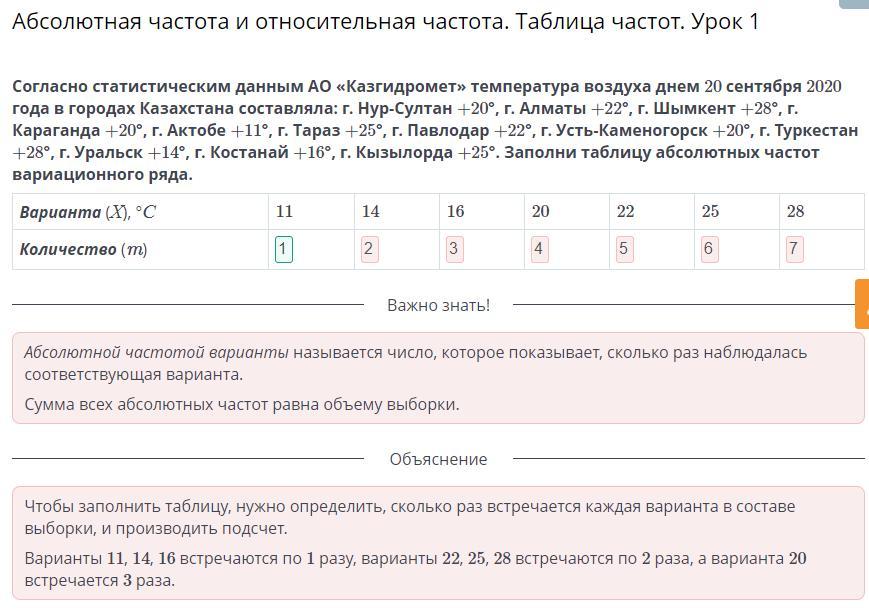 Заполни таблицу абсолютных частот вариационного ряда . Варианта (х) °С = 11 , 14, 16, 20 , 22 , 25 , 28 . Количество (m) не известно .