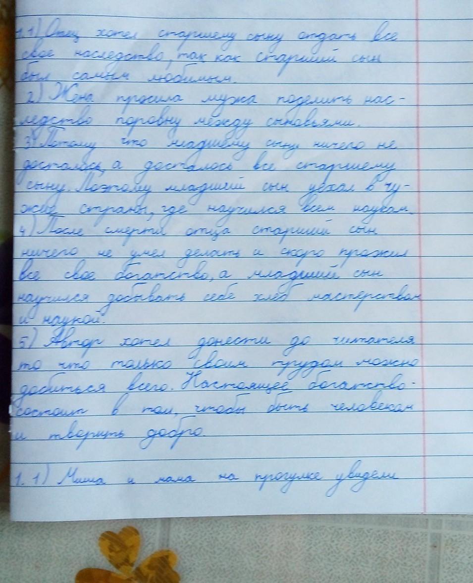 У одного купца было два сына. Старший был любимец отца, и отец всё своё наследство хотел отдать ему. Мать жалела младшего сына и просила мужа поделить наследство поровну. Купец её не послушал. Один раз мать сидела у окна и плакала. К окну подошёл странник и спросил, о чём она плачет. «Как мне не плакать! – ответила мать. - Оба сына мне равны, а отец хочет одному сыну всё отдать, а другому – ничего. У меня нет денег, и я не знаю, как помочь горю». «Твоему горю легко помочь. Объяви сыновьям, что старшему достанется всё богатство, а меньшому – ничего». Младший сын ушёл в чужие страны и выучился разным наукам, а старший жил при отце и ничему не учился, потому что знал, что он богат. Когда отец умер, старший ничего не умел делать и скоро прожил всё своё богатство, а младший выучился добывать хлеб мастерством да наукой. Сам он хорошо жил, да и другим помогал.