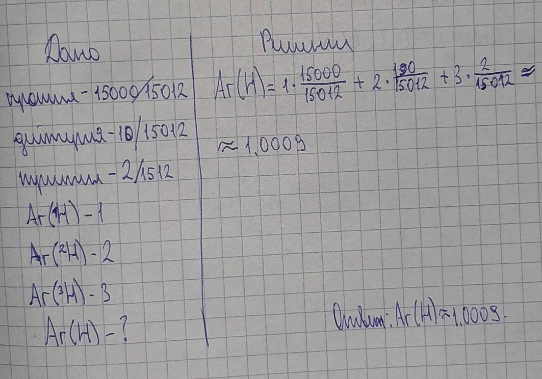 50 БАЛЛОВ! ПОМОГИТЕ С ХИМИЕЙ СРОЧНО!!! Вычисли относительную атомную массу водорода, в образце которого на каждые 15000 атомов протия приходится 10 атомов дейтерия и 2 атом(-а, -ов) трития.