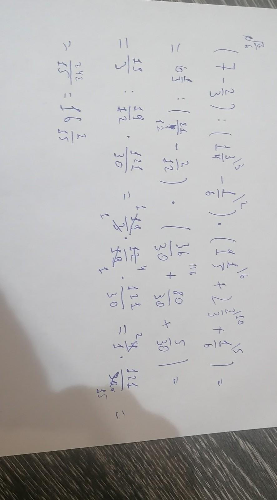 6) Ответ: (7 - 2/3) : (1 3/4 - 1/6) • (1 1/5 + 2 2/3 + 1/6) = 6 1/3 : 1 7/12 • (3 13/15 + 1/6) = 4 • 4 1/30 = 16 2/5