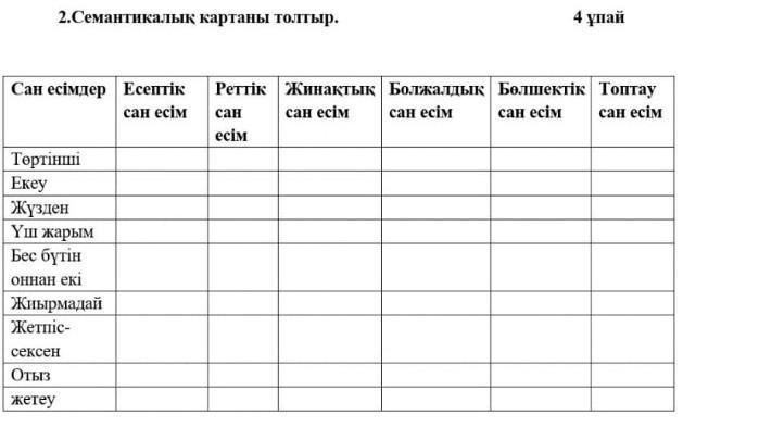 дам 25 баллов соч идёт помогите малю 2. Семантикалык картаны толтыр. Сан есімдер Есептік сан есім | сан Төртінші Екеу Жүзден Үш жарым Бес бүтін оннан екі Жиырмадай Жетпіс сексен Отыз жетеу 4 ұпай Реттік | Жинақтық Болжалдык Бөлшектік Топтау сан сан есім сан есім сан есім сан есім eciM соч идёт