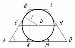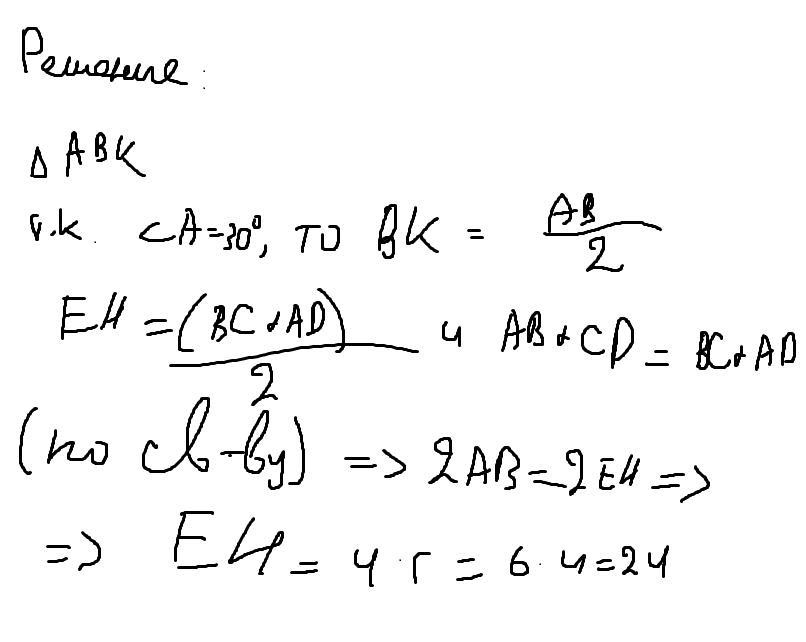 высота равно бедренного трапеции 7см.если основания угол 30градуса. нсли вписанно окружность трапеции. найти средней линии трапеции