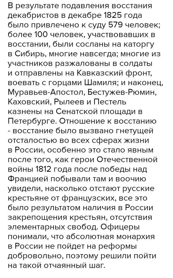 В результате подавления восстания декабристов в декабре 1825 года было привлечено к суду 579 человек; более 100 человек, участвовавших в восстании, были сосланы на каторгу в Сибирь, многие навсегда; многие из участников разжалованы в солдаты и отправлены на Кавказский фронт, воевать с горцами Шамиля; и наконец, Муравьев-Апостол, Бестужев-Рюмин, Каховский, Рылеев и Пестель казнены на Сенатской площади в Петербурге. Отношение к восстанию - восстание было вызвано гнетущей отсталостью во всех сферах жизни в России, особенно это стало явным после того, как герои Отечественной войны 1812 года после победы над Францией побывали там и воочию увидели, насколько отстают русские крестьяне от французских, все это было результатом наличия в России закрепощения крестьян, отсутствия элементарных свобод. Офицеры понимали, что абсолютная монархия в России не пойдет на реформы добровольно, поэтому решили пойти на такой отчаянный шаг.