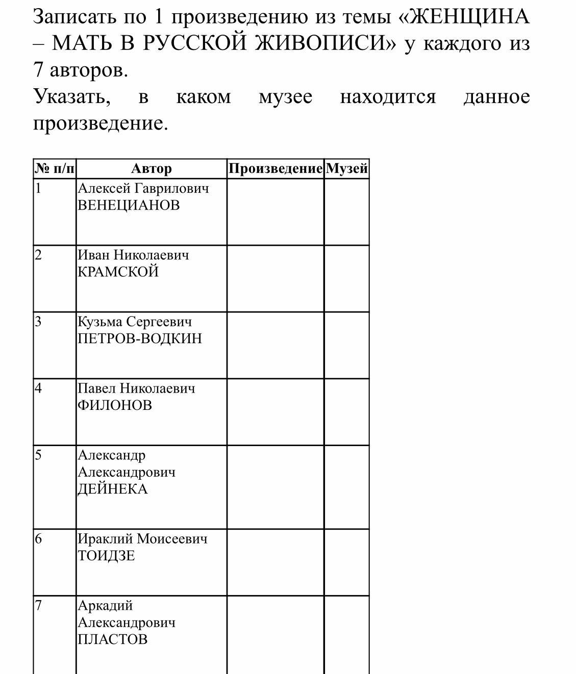 Записать по 1 произведению из темы «ЖЕНЩИНА – МАТЬ В РУССКОЙ ЖИВОПИСИ» у каждого из 7 авторов.