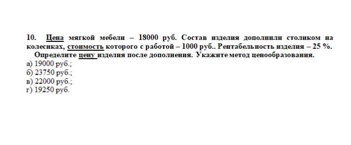 Цена мягкой мебели – 18000 руб. Состав изделия дополнили столиком на колесиках, стоимость которого с работой – 1000 руб.. Рентабельность изделия – 25 %. Определите цену изделия после дополнения. Укажите метод ценообразования.