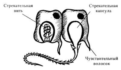 2. Стрекательные клетки имеют капсулу, заполненную ядом, который парализует жертву (нейропаралитического действия). В капсулу погружена стрекательная нить. На поверхности клетки расположен чувствительный волосок. При прикосновении к этому волоску стрекательная нить выбрасывается наружу и входит в тело жертвы.