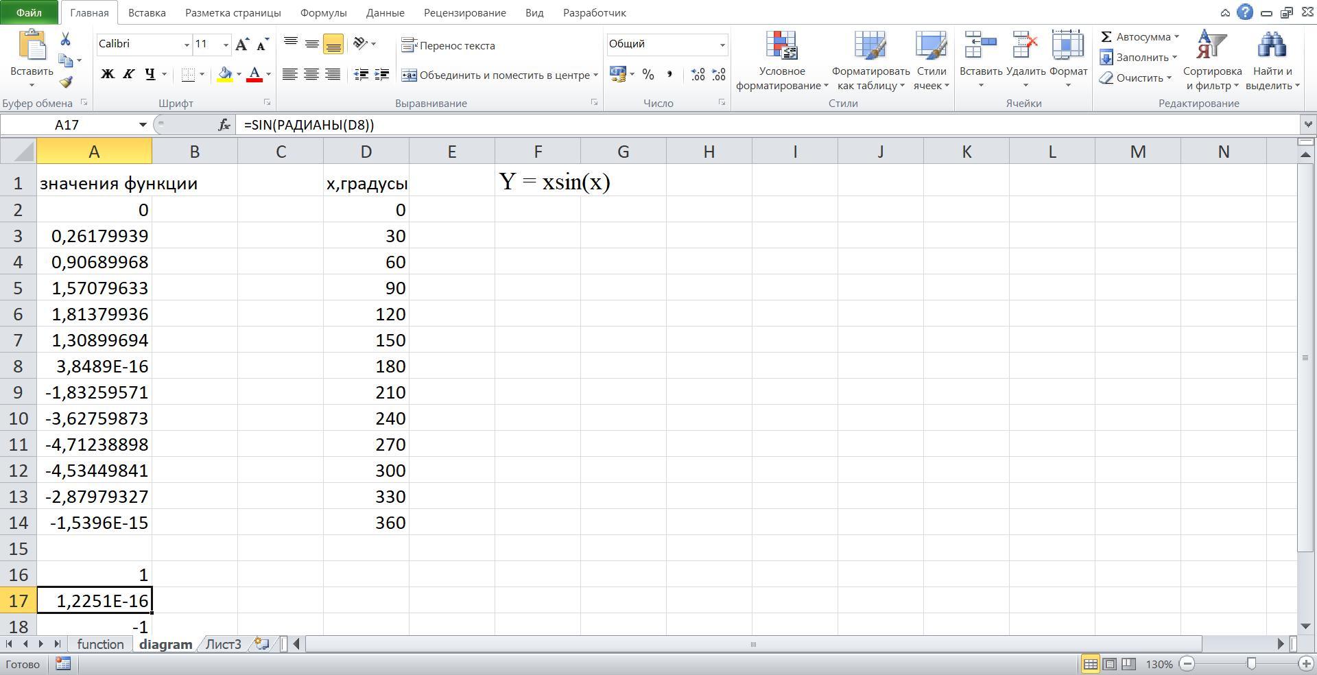 Почему в Excel значение функции синуса 180 и 360 градусов неправильно высчитывается, а со значением синуса 90 и 270 градусов все в порядке?