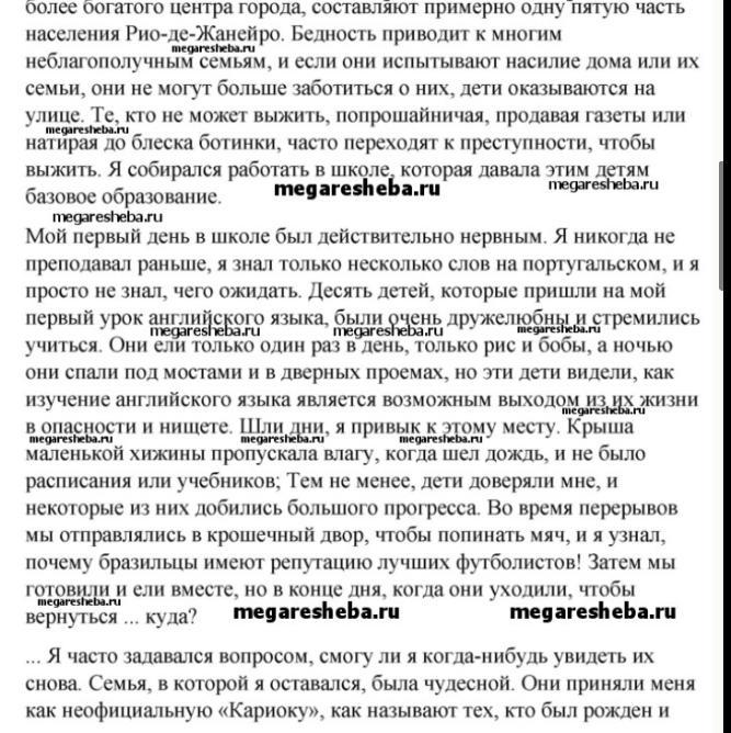 Ответ: the more affluent city center, make up approximately one fifth of Rio de Janeiro. Poverty leads to many disadvantaged families, and if they experience violence at home or their families, they can no longer take care of them, children end up on the streets. Those who cannot survive by begging, selling newspapers, or polishing their shoes to a shine often turn to crime in order to survive. I was going to work in a school that gave these children a basic education. My first day at school was really nervous. I had never taught before, I only knew a few words in Portuguese and I just didn't know what to expect. The ten children who came to my first English lesson were very friendly and very eager to learn. They ate only once a day, only rice and beans, and at night they slept under bridges and in doorways, but these children saw how learning English was a possible way out of their lives in danger and poverty. The days went by, I got used to this place. The roof of the little hut was wet when it rained and there was no timetable or textbooks; However, the children trusted me and some of them made great progress. During the breaks, we went to the tiny courtyard to commemorate the ball and I found out why Brazilians have a reputation for being the best footballer! Then we cooked and ate together, but at the end of the day when they left to return ... where? I often wondered if I might ever see them again. The family I stayed with was wonderful. They accepted me as an unofficial "Carioca", as they call those who were born and
