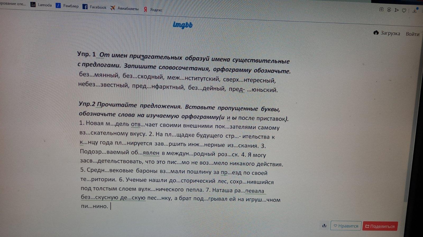 Упр. 1 Безымянный (Без имени), безысходный (Без исхода), межинститутский (Между институтов), сверхинтересный (большой интерес), небезызвестный (не без вести), предынфарктный( Перед инфарктом), безыдейный (Без идей), предыюньский (Перед июнем (месяц))