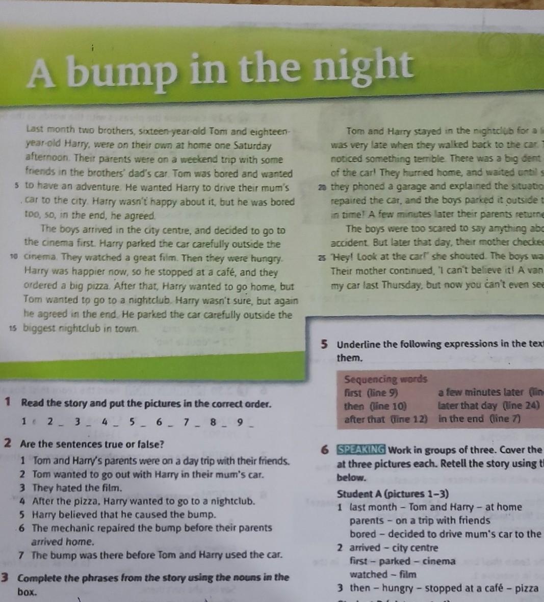 В прошлом месяце два брата, годовалый том и восемнадцатилетний Гарри, были одни дома в субботу днем. Их родители были в поездке на выходные с друзьями в машине отца братьев, тому было скучно, и он хотел, чтобы у 5 было приключение, он хотел, чтобы Гарри отвез их мамину машину в город. Хэтри это не радовало, но ему тоже было скучно, поэтому в конце концов он согласился, чтобы мальчики приехали в центр, и решил сначала пойти в кино. Гарри осторожно припарковал машину возле кинотеатра "10", где они смотрели отличный фильм. Потом они проголодались, Гарри стал счастливее, поэтому он зашел в кафе, и они заказали большую пиццу. После этого Гарри захотелось домой, а Том - в ночной клуб. Гарри не был уверен, но в конце концов снова согласился. Он осторожно припарковал машину возле "Тома", и Гарри остался в "Форде", когда они вернулись к машине, было уже очень поздно. заметил что-то темное. Там была большая вмятина от Карла, который они привезли домой, и ждали, пока они не позвонили в гараж и не объяснили ситуацию, отремонтировали машину, и мальчики припарковали ее снаружи вовремя! Через несколько минут вернулись их родители, мальчики были слишком напуганы, чтобы сказать что-нибудь о несчастном случае. Но позже в тот же день их мать проверила 2 Эй! Посмотри на Карла! - крикнула она. Их мать продолжала: "я не могу в это поверить! Фургон мой автомобиль в прошлый четверг, но теперь вы даже не можете увидеть 15 самых больших ночных клубов в городе 5 5 подчеркните следующие выражения в tex them. 1 прочитайте рассказ и поставьте картинки в правильном порядке. 1 3 4 5 6 7 8 последовательность слов сначала (строка 9) через несколько минут (линь затем (строка 10) позже в тот же день (строка 24) после этой строки 12) конец (строка 7) 2 2 являются ли предложения истинными или ложными? Родители Тома и Гарри были в однодневной поездке со своими друзьями. Том хотел поехать с Гарри в маминой машине. 3 они ненавидели этот фильм. После пиццы Гарри захотелось пойти в ночной клуб. Гарри считал, что это он вызвал удар. 6 механик починил отбойник еще до того, как родители вернулись домой. 7 удар был там еще до того, как Том и Гарри воспользовались машиной. 3 3 завершите фразы из рассказа, используя существительные в 6 разговорной работе в группах по три человека. Покройте по три фотографии каждая. Пересказывать рассказ, используя т ниже. Студент а (фото 1-3)я в прошлом месяце-том и Гарри - дома родители - в поездке с друзьями скучно-решил отвезти мамину машину в 2-й подъезд-центр города первый-припарковался - кинотеатр посмотрел-кинобокс. 3 потом-голодный-остановился в кафе-Пицца