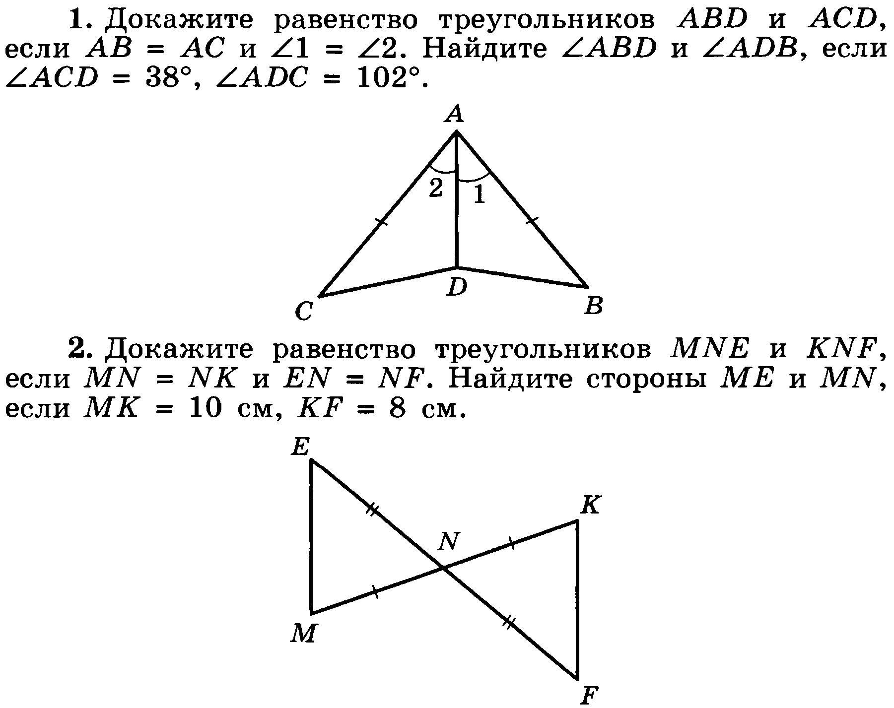 2. Треугольники MNE и KNF равны по углу и двум прилежащим к нему сторонам: MN = NK и EN = NF по условию, а угол ENM = KNF тк они являются вертикальными углами.
