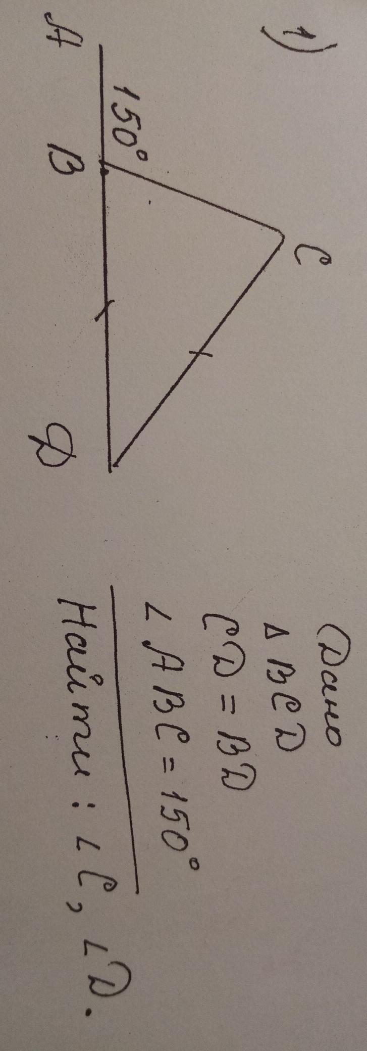 Известно, что сумма углов треугольника равна 180°. Тогда CBD + C + D = 180°, из этого следует D = 180 - C - CBD = 180 - 30 - 30 = 120°