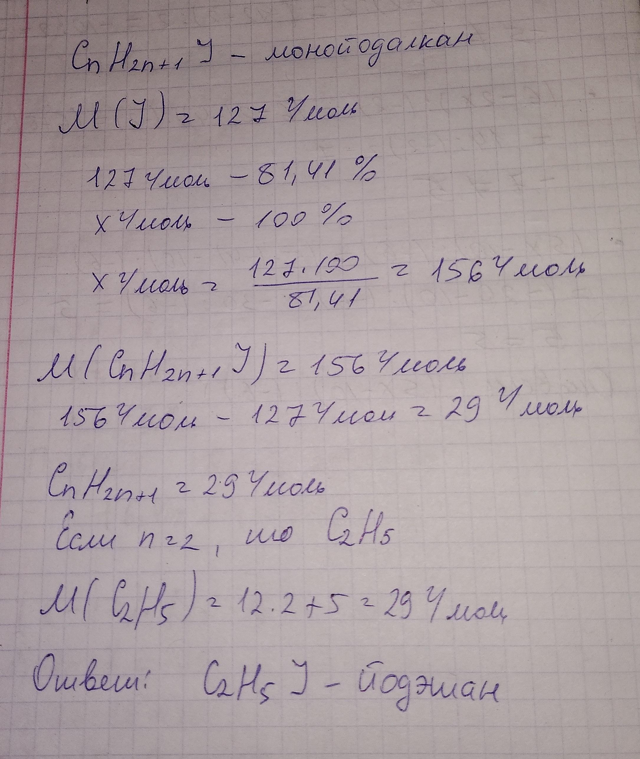 Установите молекулярную формулу монойодоалкана, содержащего 81,41% Йода. Укажите в ответе его название. (IUPAC)