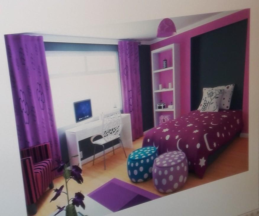 Ответ: In this room, there are purple curtains, magenta walls and a purple bed with moons and stars on it. There is a big window and a white desk with a computer on it. There are two cushions at the foot of the bed; one is teal and the other is purple. There is a carved white chair and a magenta and black striped armchair. There is a purple plant and a purple rug.