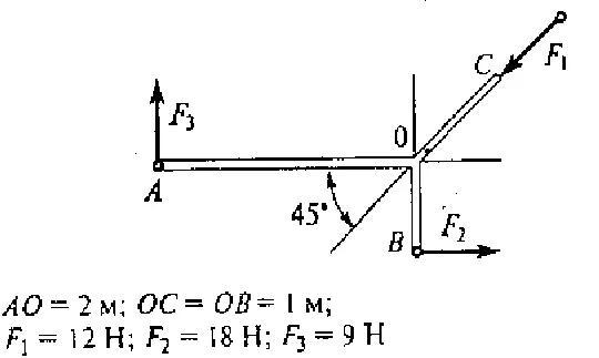 Определить сумму моментов относительно точки О. АО = 1,5м; ОС = ОВ = 2м. F1= 10H; F2 = 15H; F3= 8H