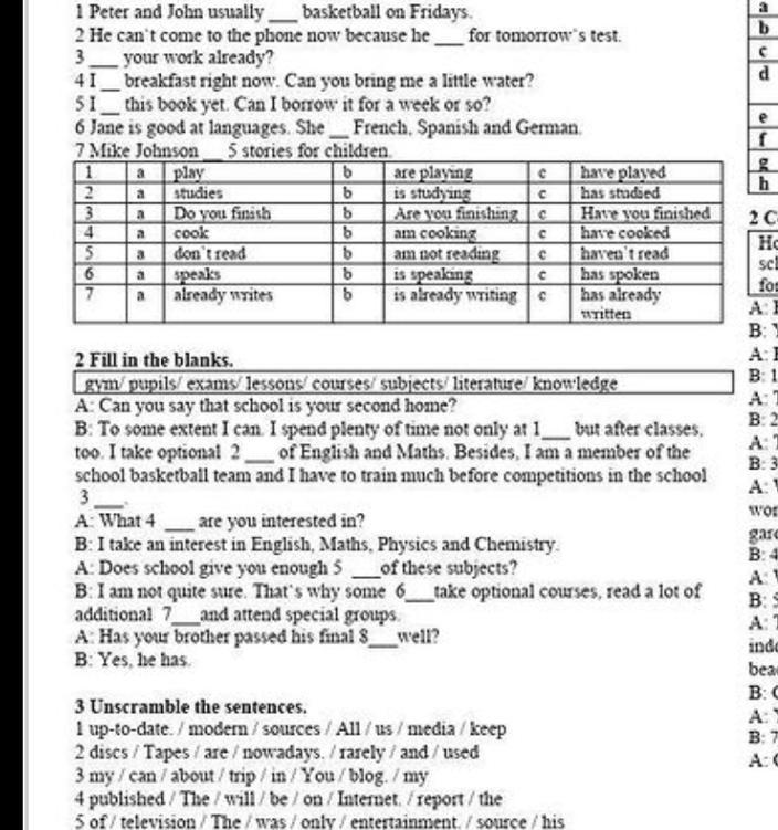 1. lessons, 2. courses, 3. gym, 4. subjects, 5. knowledge, 6. pupils, 7. literature, 8. exams