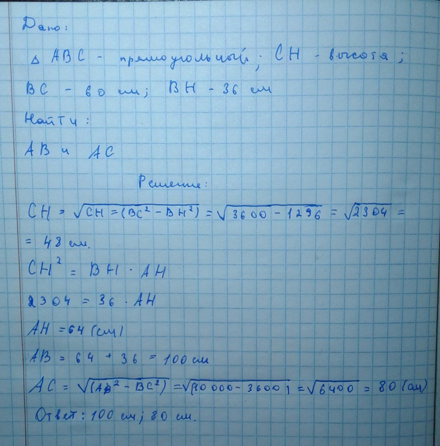 Дано: ΔАВС - прямоугольный, СН - высота, ВС=60 см, ВН=36 см. Найти АВ и АС.