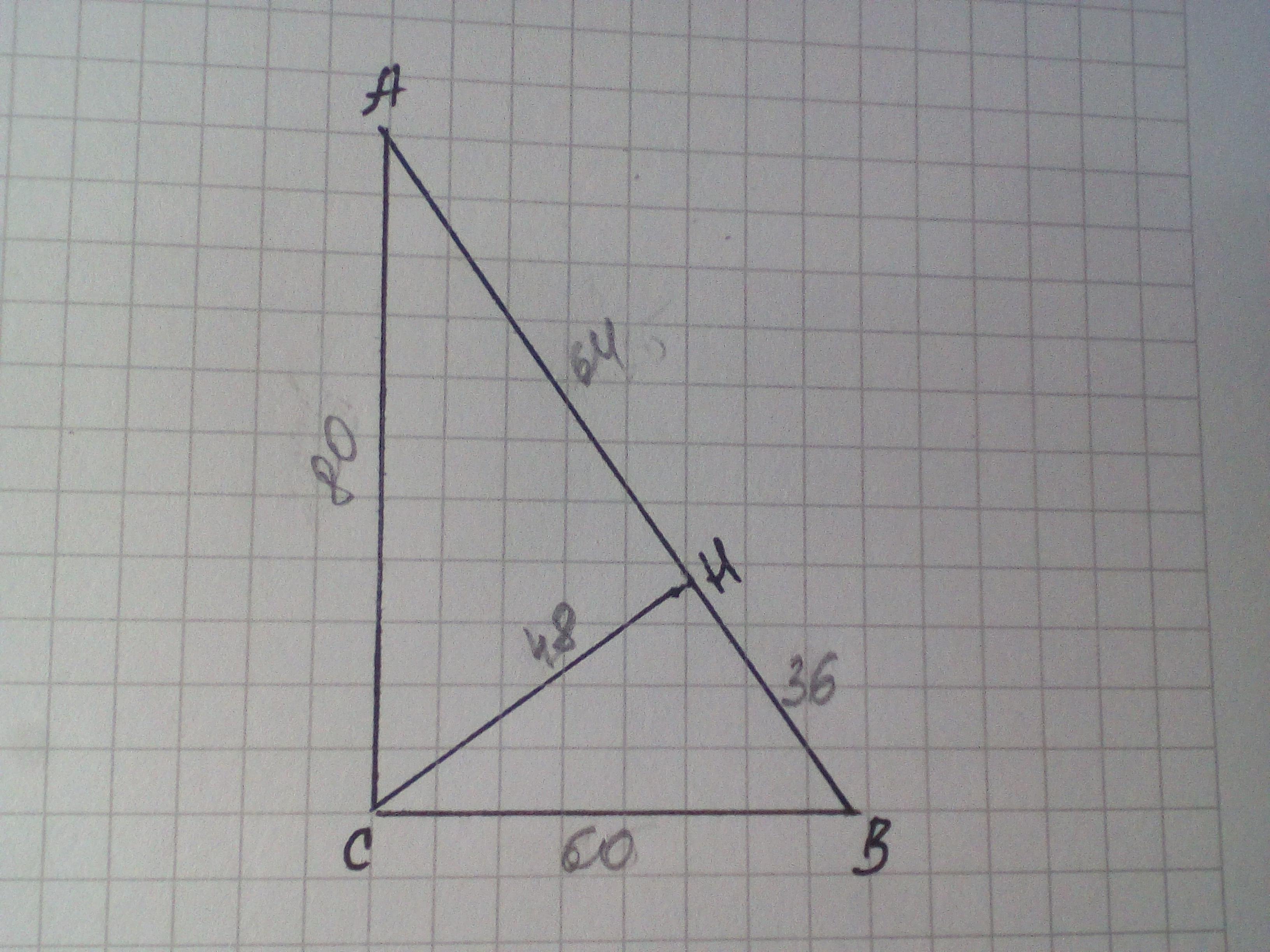 В прямоугольном треугольнике ABC его катет равно на 60 см, а его проекция на гипотенузу 36 см.