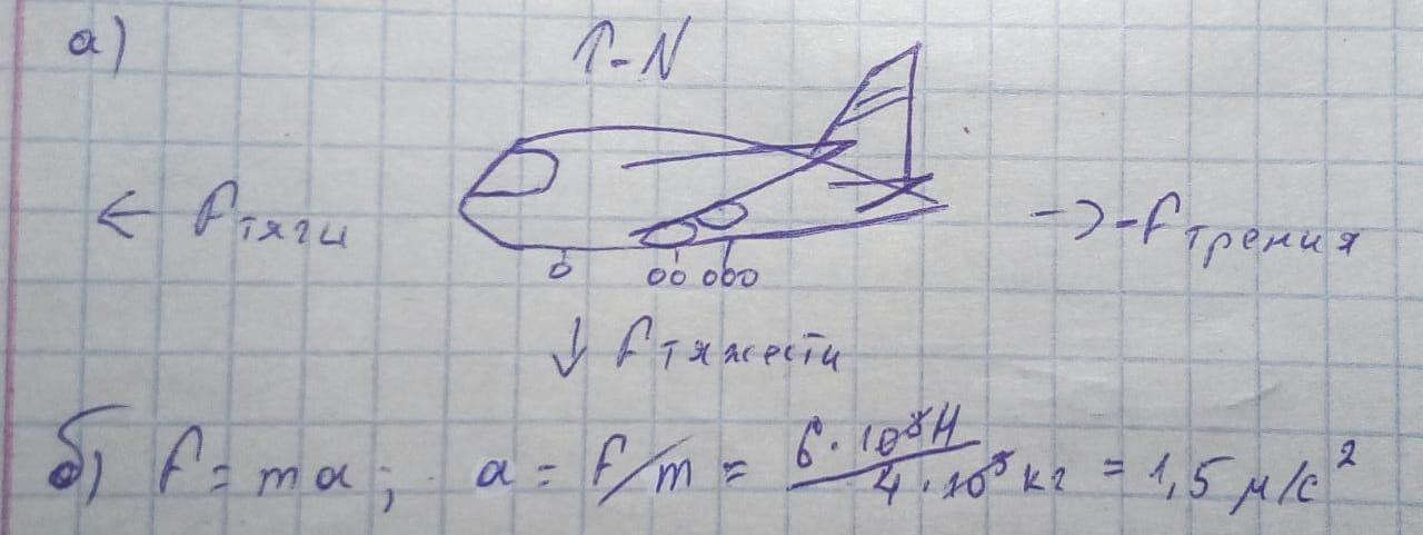 b) Определите ускорение, с которым двигается самолет массой 4 т при разбеге, если равнодействующая сил равна 6 кН.
