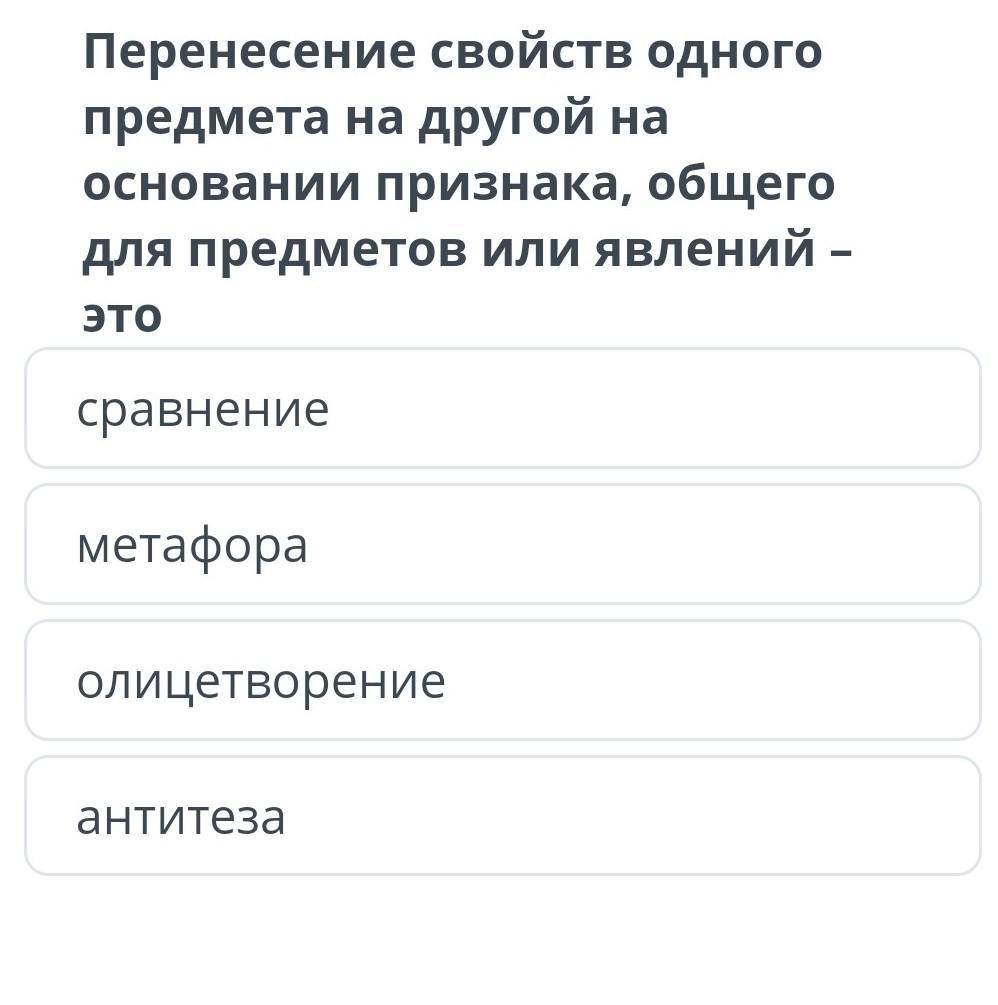 Объяснение:Метафора (от греч. Metaphora - перенос) — это перенос названия с одного предмета, действия, свойства, явления на другие действия, свойства, явления на основе сходства их признаков (например, форма, цвет, функция, расположение и др.).
