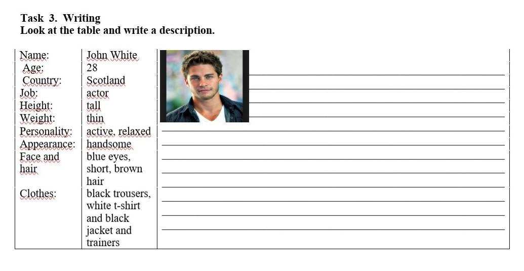 His name is John White and he is 28 years old. He lives in Scotland. Also he works as an actor. He is handsome because he is tall and thin. Also he has blue eyes and short, brown hair. In real life he is active and relaxed. Usually he wears black trousers, white T shirt and black jacket and trainers.