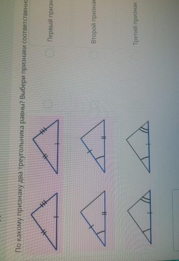 по какому признаку два треугольника равны? выбери признаки соответствие изображению