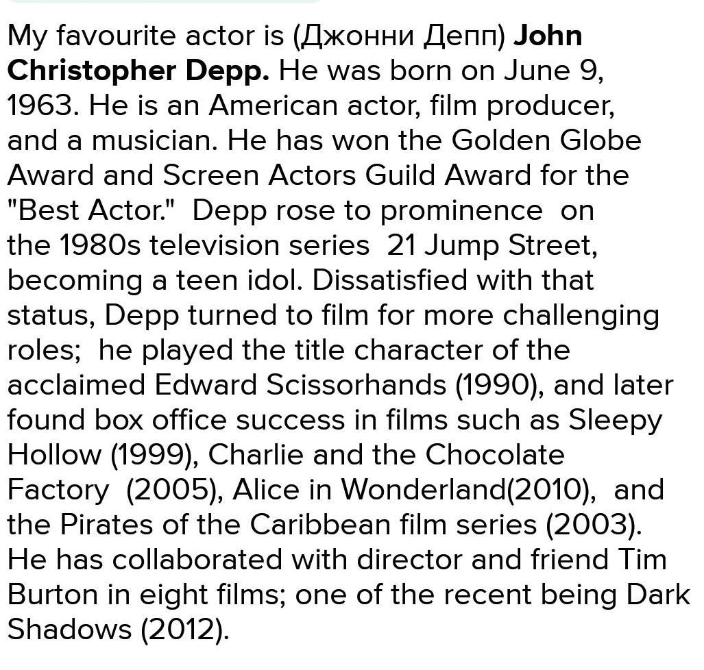 Напиши пост у себя в блоге в котором ты описываешь мвоего любимого актёра или актрису. Обязательно следуй по плану на Английском языках
