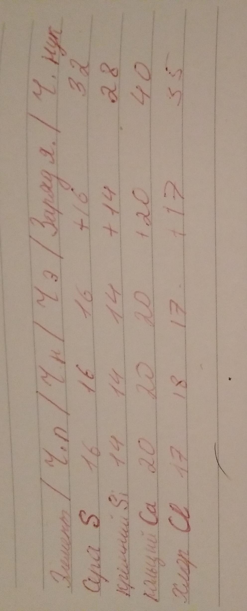 Элемент:Сера S, Число протонов:16, Число нейтронов:16, Число электронов:16, Заряд ядрa:+16, Число нуклонов:32.