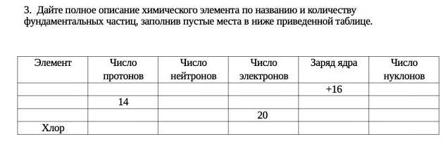 Дайте полное описание химического элемента по названию и количеству фундаментальных частиц, заполнив пустые места в ниже приведенной таблице.