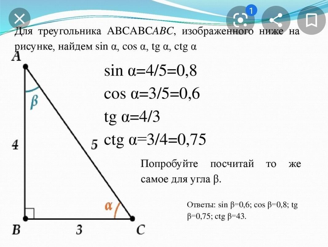 Если в прямоугольном треугольнике ctga = 3/4, то a) по условию задачи построить прямоугольный треугольник и нарисовать угол A B) вычислить cos a