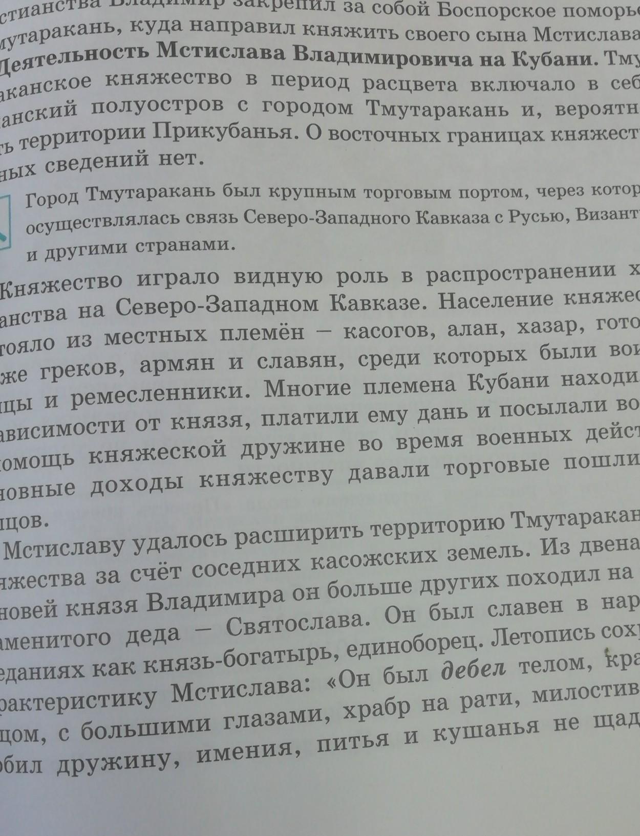 Объяснение:Население княжества состояла из местных племен:касогов,Алан,хазар,готов,греков,армян,славян, среди которых были воины, купцы и ремесленники.Большенство племён зависили от князя, платили ему дань и посылали воинов.Мстиславу удалось расширить территорию Тмутаранского княжества.характеристика Мстислава:Красноват лицом,с большими глазами , храбр на рати, милостив, очень любил дружину, имения, питья и кушать не щадил для неё.