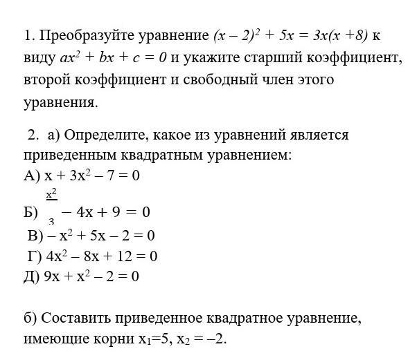 2. В приведённом квадратном уравнении старший коэффициент равен 1. Этому условию удовлетворяет уравнение Д):