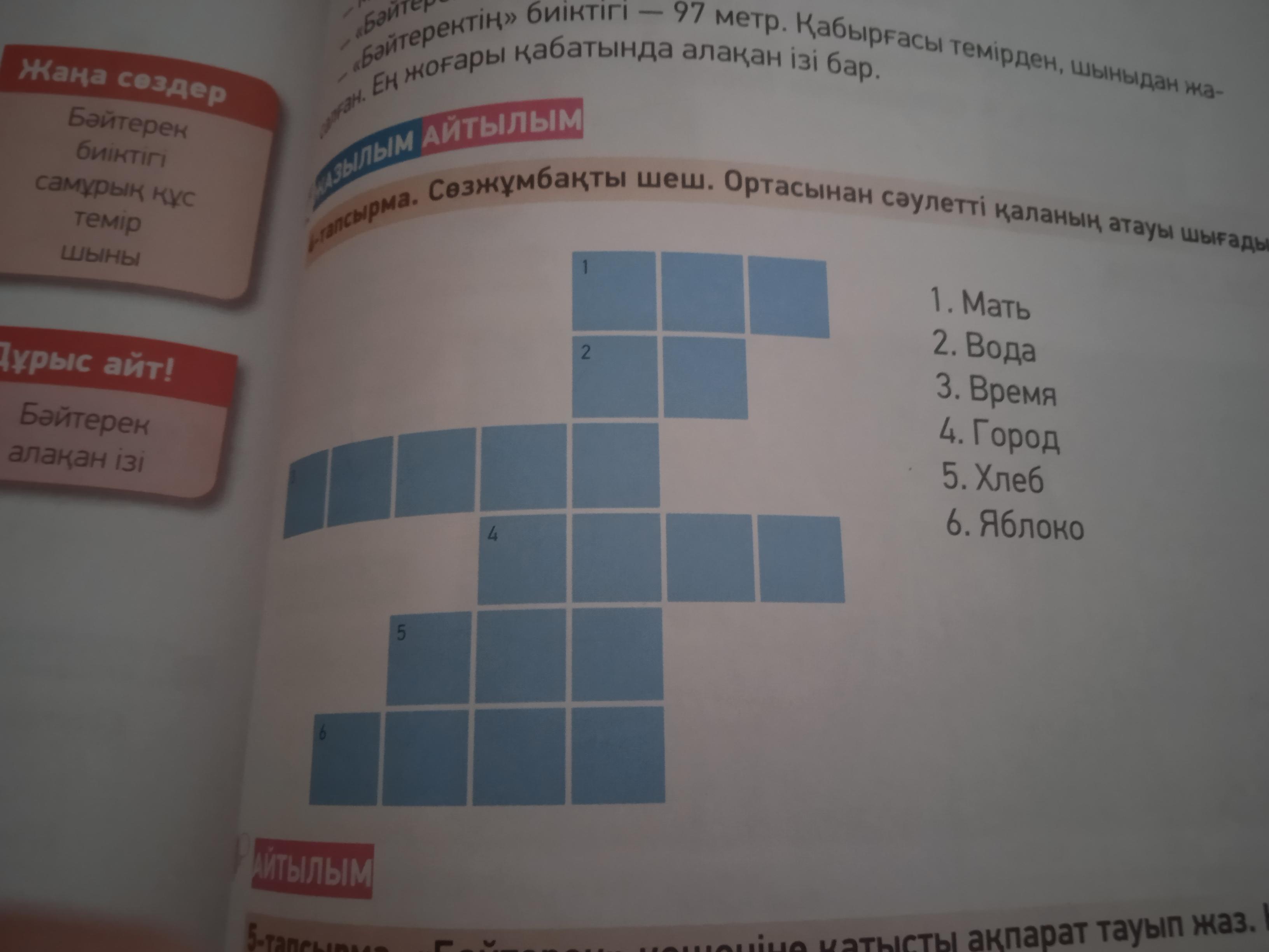 1. ана, 2. су , 3. уақыт, 4.қала, 5. нан, 6. алма