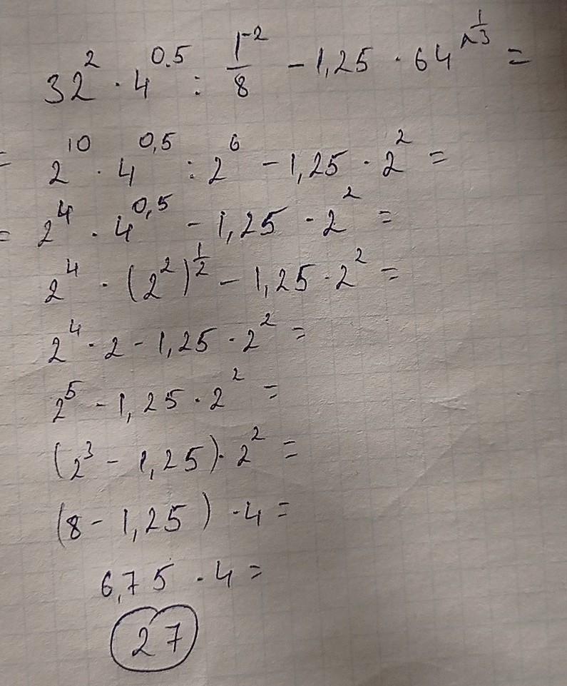 Значение выражения: 32^2 • 4^0,5 : 1/8^-2 - 1,25 • 64^1/3 равно: а) 2; в) 3; с) 1; д) 27; е) 4