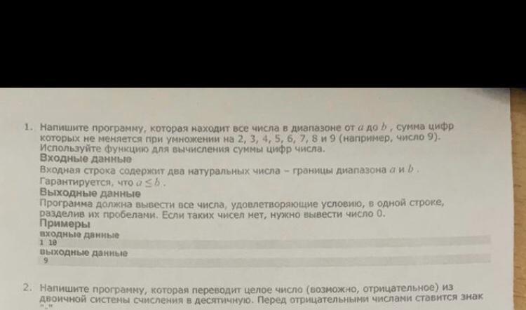 Помогите, пожалуйста! PYTHON. Напишите программу, которая находит все числа в диапазоне от a до b , сумма цифр которых не меняется при умножении на 2,3,4,5,6,7,8 и 9 (например, число 9). Используйте функцию для вычисления суммы цифр числа.